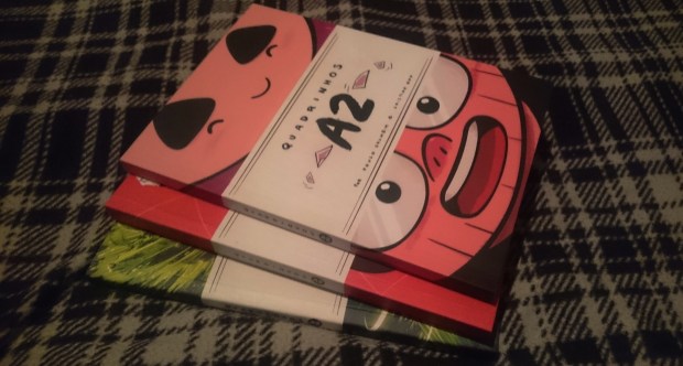 Quadrinhos A2 é um projeto criado pelo casal de quadrinistas Paulo Crumbim e Cristina Eiko, eu tive o prazer de conhecê-los na última Comic Con aqui em São Paulo, na verdade eu ia só pegar um autógrafo na minha edição de Penadinho: Vida, porém ao me deparar com a lindeza que era a mesa dos dois, acabei levando tudo, sim gente, comprei tudo que eles estavam vendendo.
