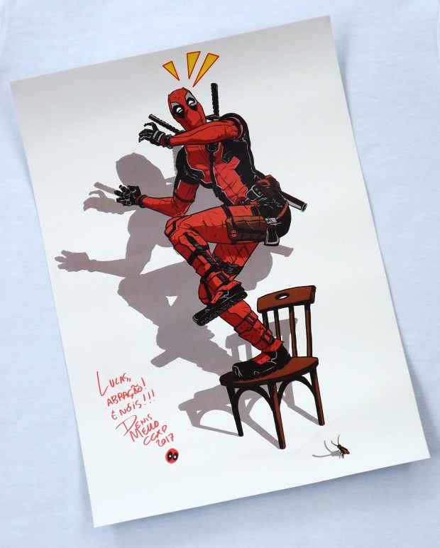 Eu conheci o trabalho do Denis Mello pelo quadrinho “Beladona” que comprei na primeira edição do evento que pude ir e, desde então, não deixo de passar na mesa dele! O mais recente trabalho do quadrinista é o maravilhoso e necessário “Teocrasília” e ele sempre leva prints incríveis nos eventos, na última CCXP eu comprei um do Deadpool subindo em uma cadeira com medo de uma barata!