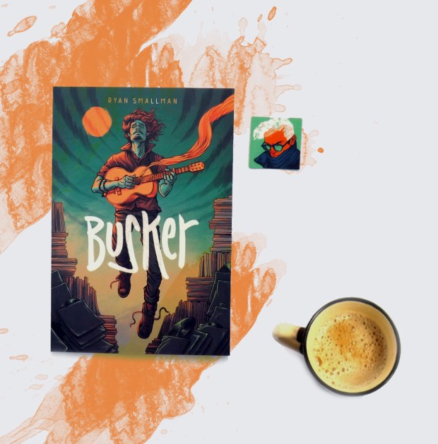 Logo que entrei no AA dei de cara com a mesa do Ryan Smallman, o ilustrador do Omelete, e eu sabia que ele estaria ali com o lançamento do seu primeiro quadrinho, o “Busker”. O Ryan foi extremamente gentil, me explicou o conceito do quadrinho, conversamos um pouco sobre suas inspirações e sobre o Camilo Solano, lembro que ele me perguntou se eu conhecia o trabalho do Camilo e eu logo avisei que era super fã, então ele me mostrou que o Camilo foi responsável pelo prefácio do quadrinho e revelou que esse trabalho possui une suas duas paixões, o desenho e a música, a canção retratada na estória existe e foi criada pelo Ryan e sua namorada. O trabalho é descrito como uma história de amor entre um artista e sua arte.