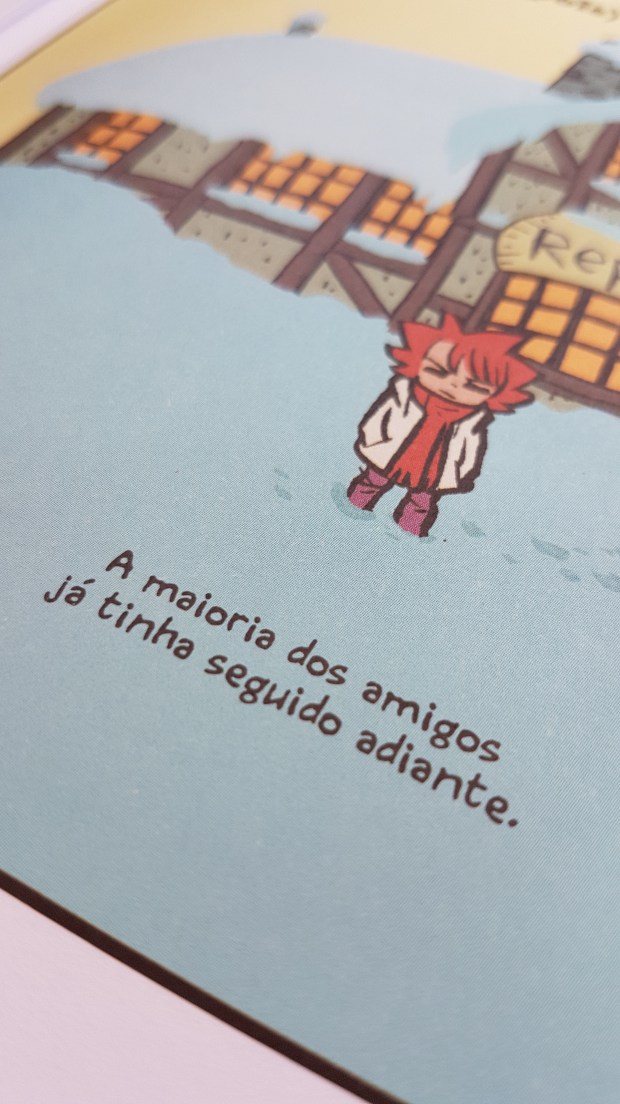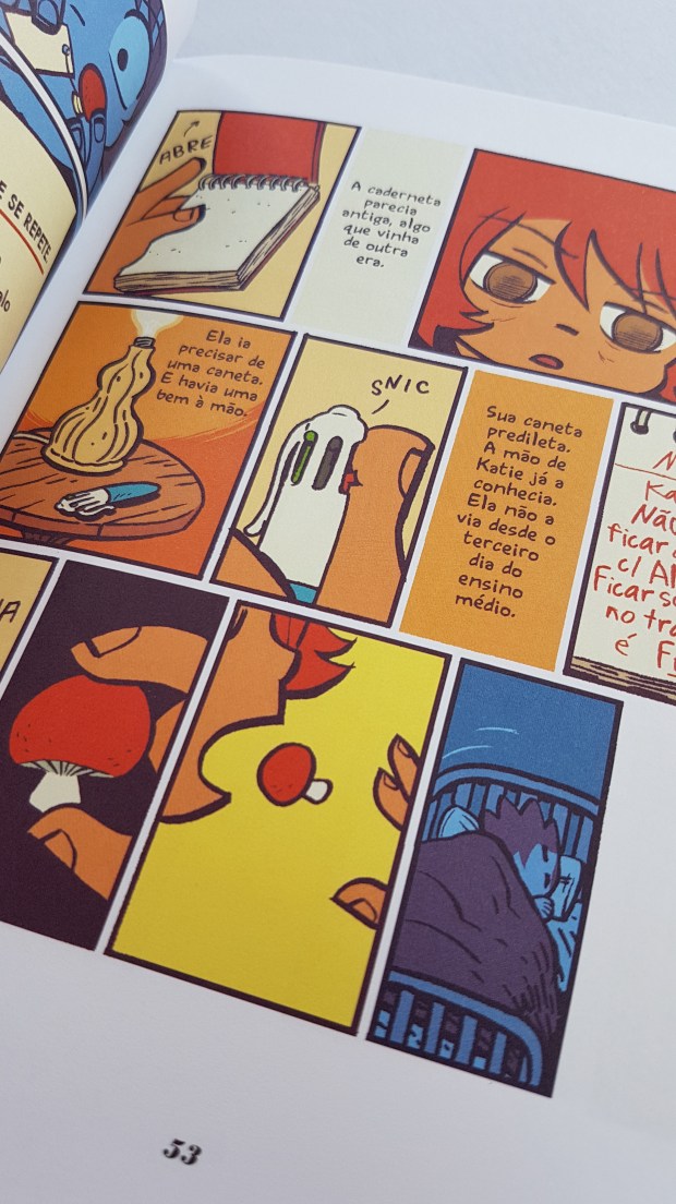 O traço de O’Malley é bem cartunesco, esse quadrinho poderia e deveria ganhar uma adaptação animada. O quadrinista consegue passar sua mensagem de forma sutil, agregando humor às situações nas quais Katie acaba se metendo ao alterar seu passado, constrói personagens extremamente carismáticos, até mesmo os que aparecem pouco movimentam a trama de alguma forma e possuem uma função específica, as cores de Nathan Fairbairn somam muito ao traço do artista e a escolha da paleta de cores me agradou, ela vai mudando junto com a personagem, ora adquirindo tons mais quentes, ora frios e até mesmo ganhando aspectos sombrios quando tudo foge ao controle.